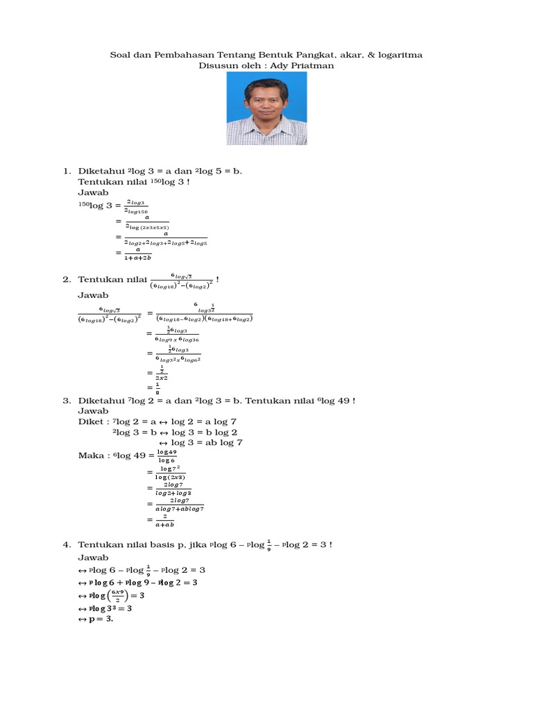 Bentuk pangkat, akar dan logaritma jika a adalah 'sukses', maka rumusnya adalah 'a=x+y+z', dimana x adalah 'kerja', y adalah 'bermain', dan z adalah jaga mulut anda agar tetap tertutup. (albert einstein) materi bentuk pangkat, bentuk akar dan logaritma adalah materi matematika yang menyambut siswa pertama kali saat menginjak bangku sma. Logaritma hubungan akar, pangkat dan logaritma jika akar adalah bentuk lain dari pangkat, maka logaritma adalah lawan dari pangkat. Contoh soal bentuk pangkat, akar, dan logaritma yang diberikan di sini merupakan kumpulan soal untuk tingkat level kognitif pengetahuan dan pemahaman.melalui halaman ini, idschool akan berbagi contoh soal bentuk pangkat, akar, dan logaritma. Contoh soal bentuk pangkat, akar, dan logaritma yang diberikan di sini merupakan kumpulan soal untuk tingkat level kognitif penalaran.melalui halaman ini, idschool akan berbagi contoh soal bentuk pangkat, akar, dan logaritma. Soal dan pembahasan bentuk pangkat akar dan logaritma pdf.