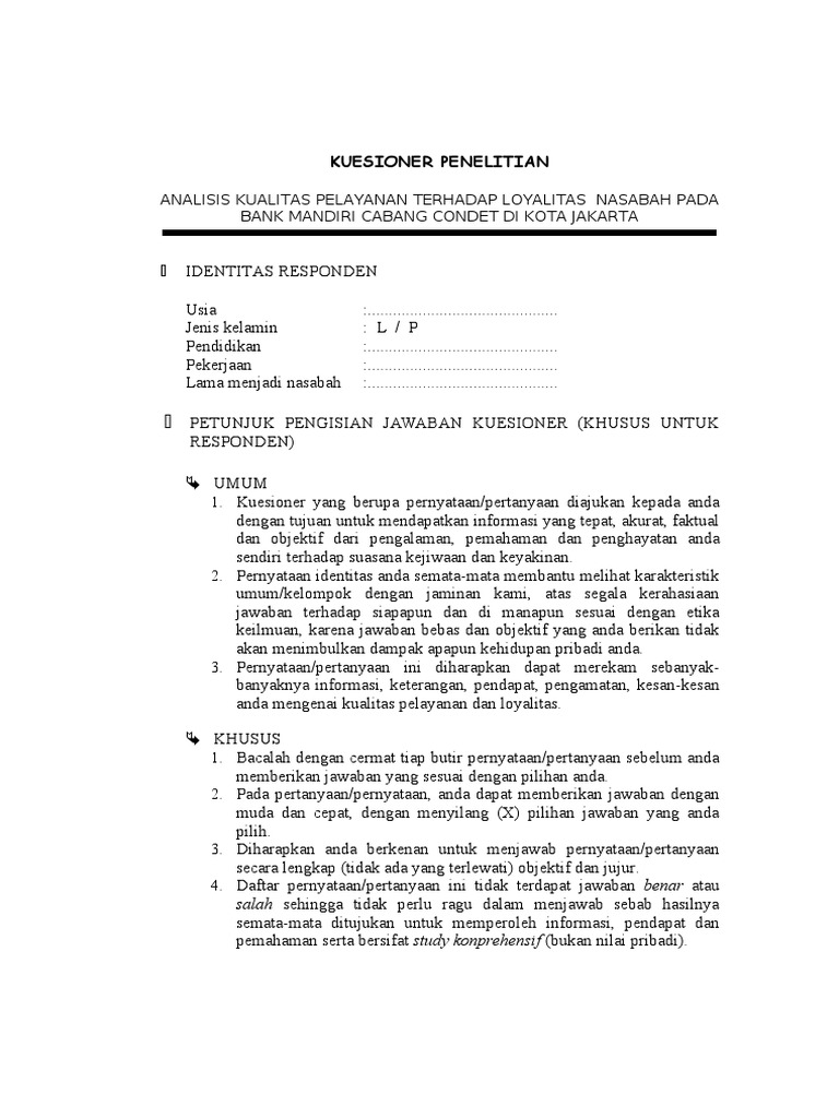 Pdf Contoh Kuesioner Kepuasan Pelanggan Nurleni Firman Academia Edu from 0.academia-photos.com Kuesioner yang baik biasanya terdiri dari surat permohonan menjadi responden, lembar persetujuan menjadi responden, dan kuesioner. See full list on idtesis.com Jun 03, 2018 · contoh format kuesioner penelitian. Apr 10, 2019 · format kuesioner (skripsi dan tesis) emory (1995) dalam bukunya husein umar (2005) komponen inti kuesioner menurut emory, ada 4 komponen inti dari sebuah kuesioner yaitu : Ini yang membuat kuesioner bisa dengan mudah diakses siapa saja. Demikian ulasan mengenai contoh kuesioner sekaligus berbagai penjelasan lengkapnya. Mar 24, 2021 · kuesioner skripsi kuesioner skripsi berikut ini adalah kuesioner yang berisikan pernyataan tentang motivasi siswa menggunakan aplikasi buku berbasis gambar dalam belajar bahasa inggris. Contoh cara membuat lampiran kuesioner skripsi ter.